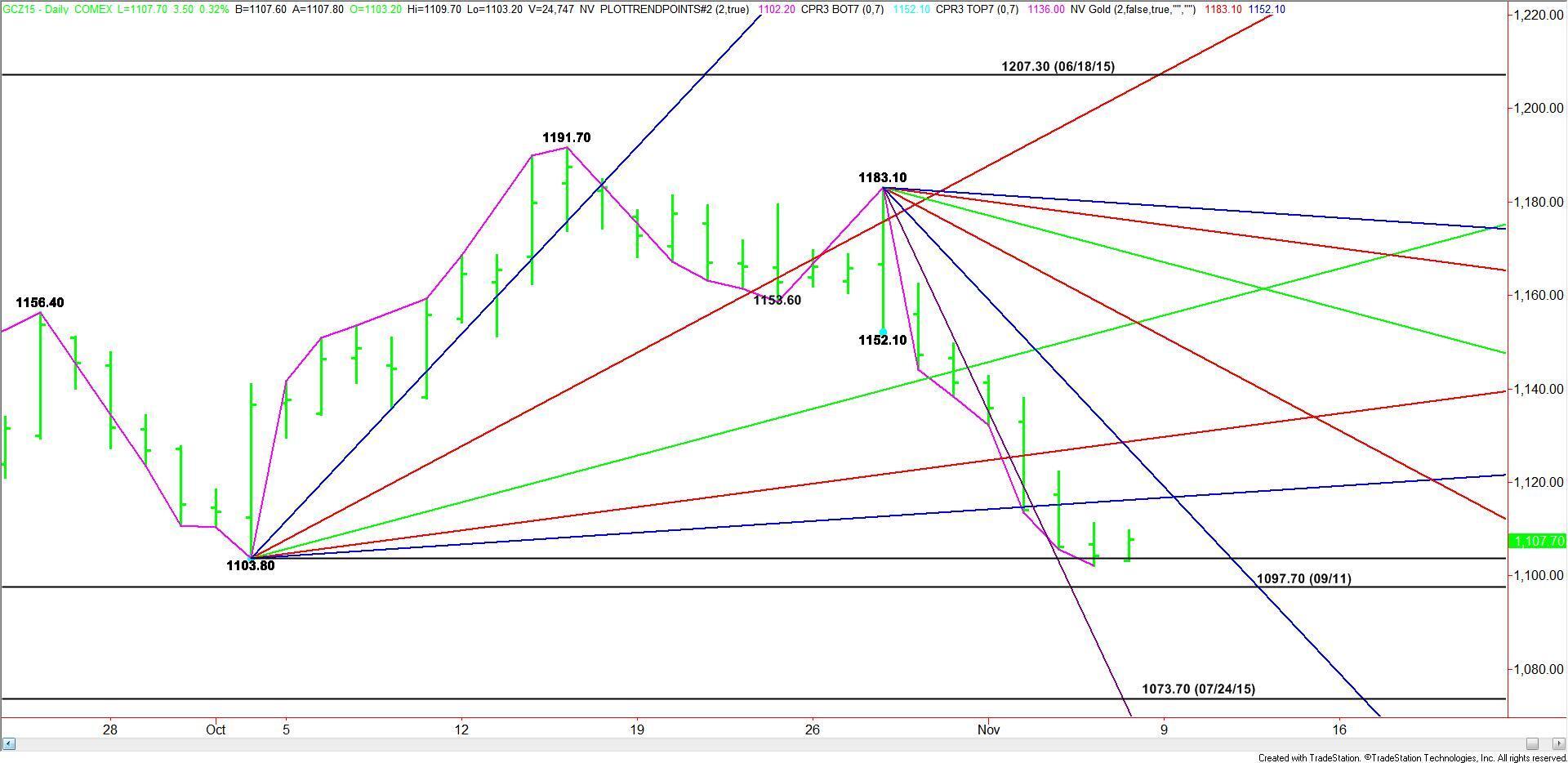 Look for a bullish tone to develop on a sustained move over $1103.80. The first upside objective is a long-term uptrending angle at $1116.30. This is followed by a steep downtrending angle at $1127.10 and another long-term uptrending angle at $1128.80.