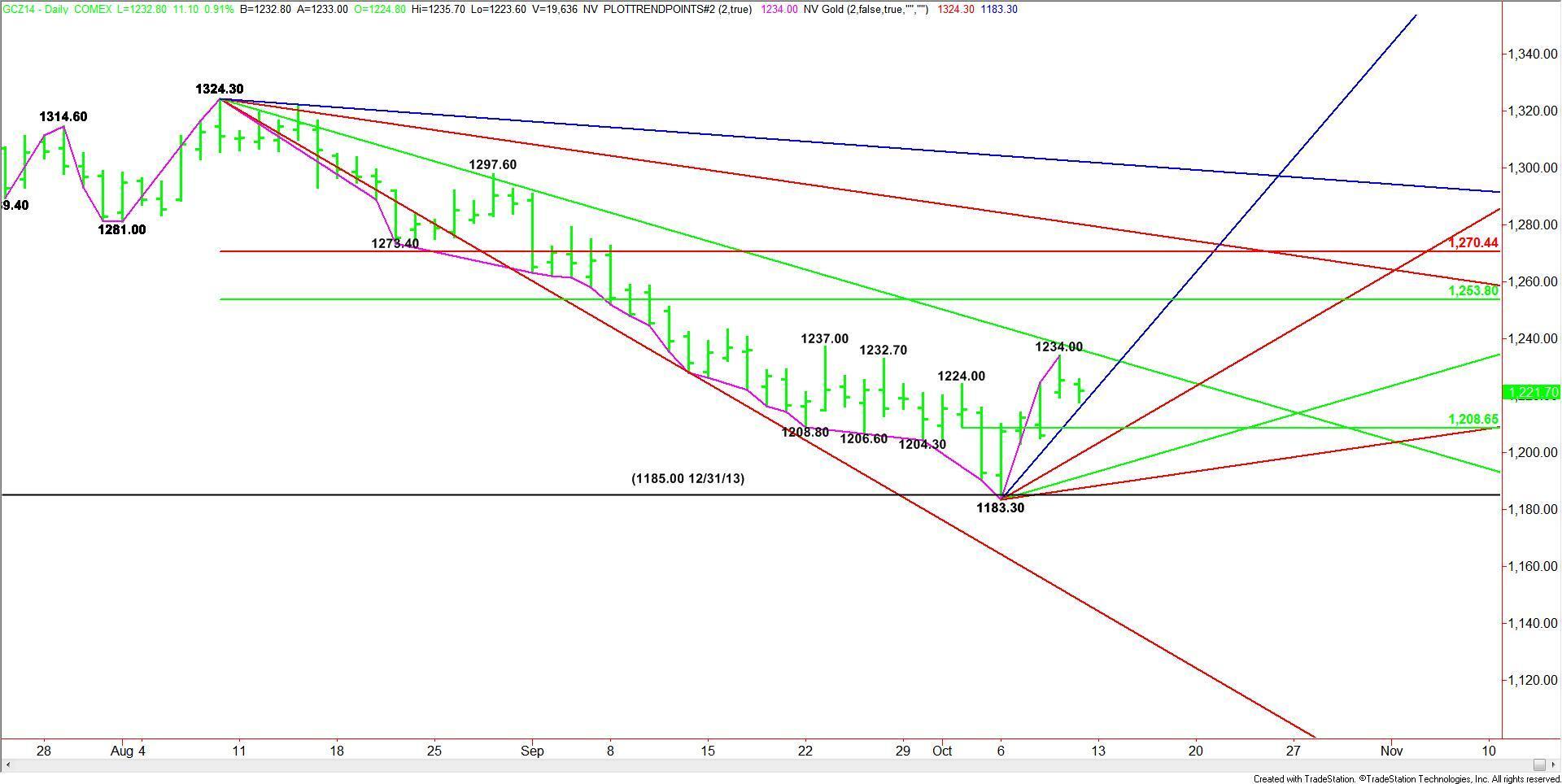 If this market is setting up to move higher, then it has to pick up support on a pullback into the pivot at $1208.60 or the uptrending angles at $1203.30 and $1193.30. Bullish traders will try to form a secondary higher bottom.