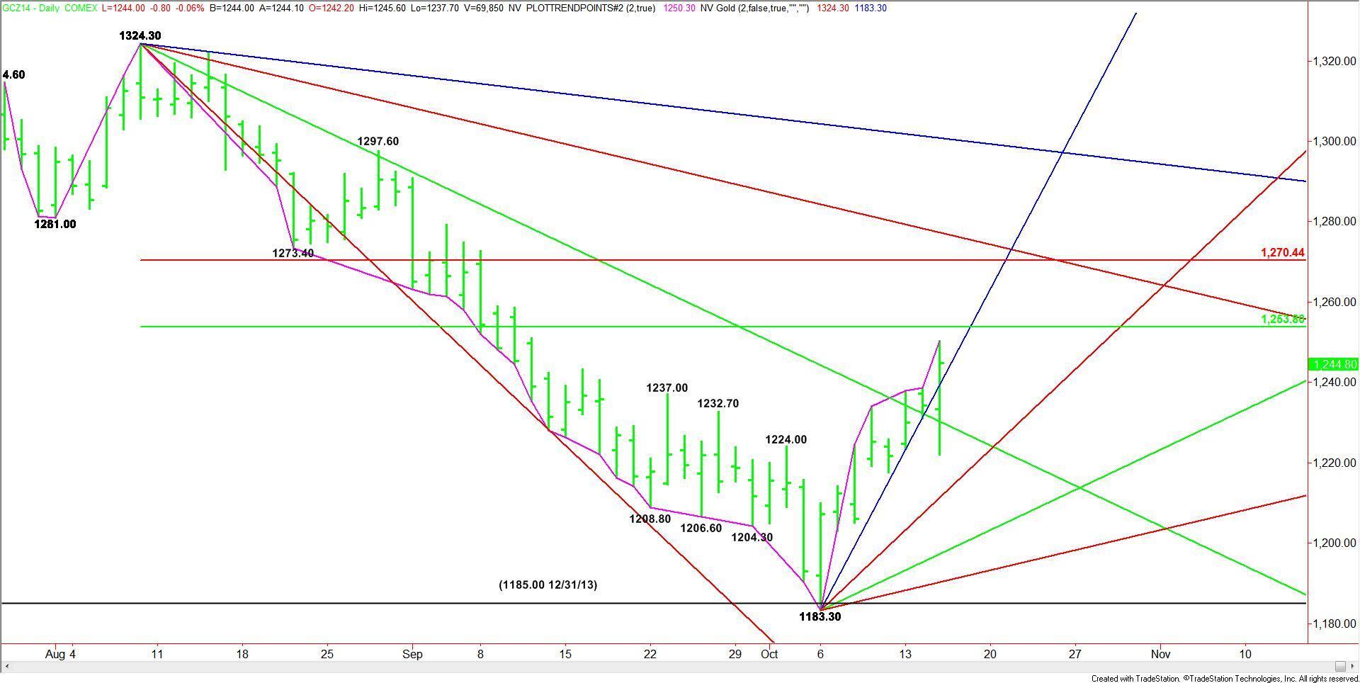 The main range is $1324.30 to $1183.30. Its retracement zone at $1253.80 to $1270.40 is the next major upside target. Since the main trend is down on the daily chart, traders should watch for sellers on a test of this retracement zone.