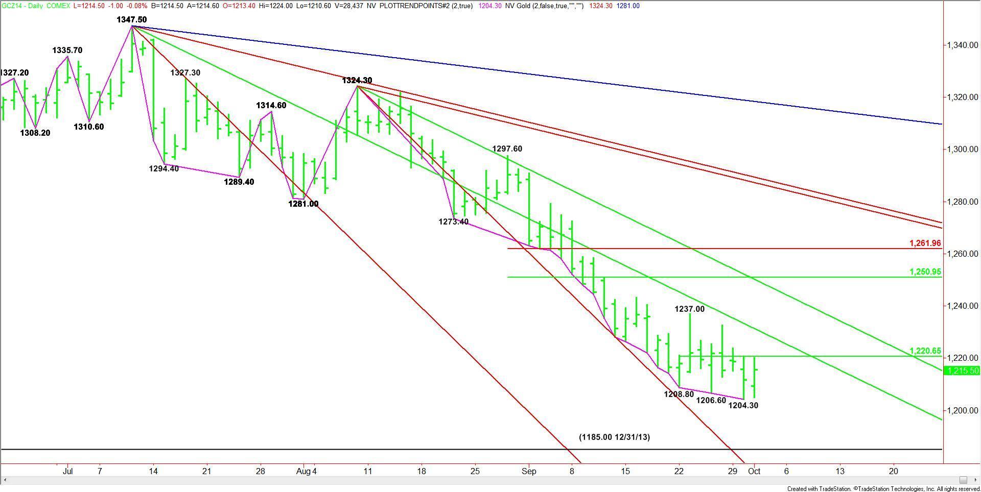 The short-term range is $1237.00 to $1204.30. The pivot price of this range at 1220.70 is controlling the short-term direction of the market. Overtaking 1220.70 and holding this level should trigger a fast rally into a downtrending angle at $1227.50. A breakout over this level is likely to trigger a further rally into last week’s high at $1237.00.
