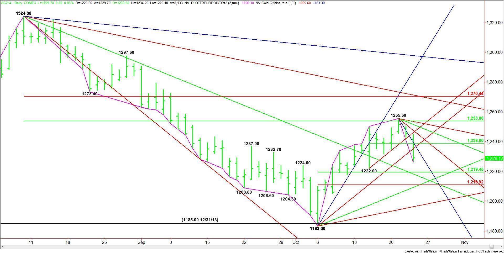 December Comex Gold futures traded lower for a second day, making $1255.60 a new main top. The new main range is $1183.30 to $1255.60. The retracement