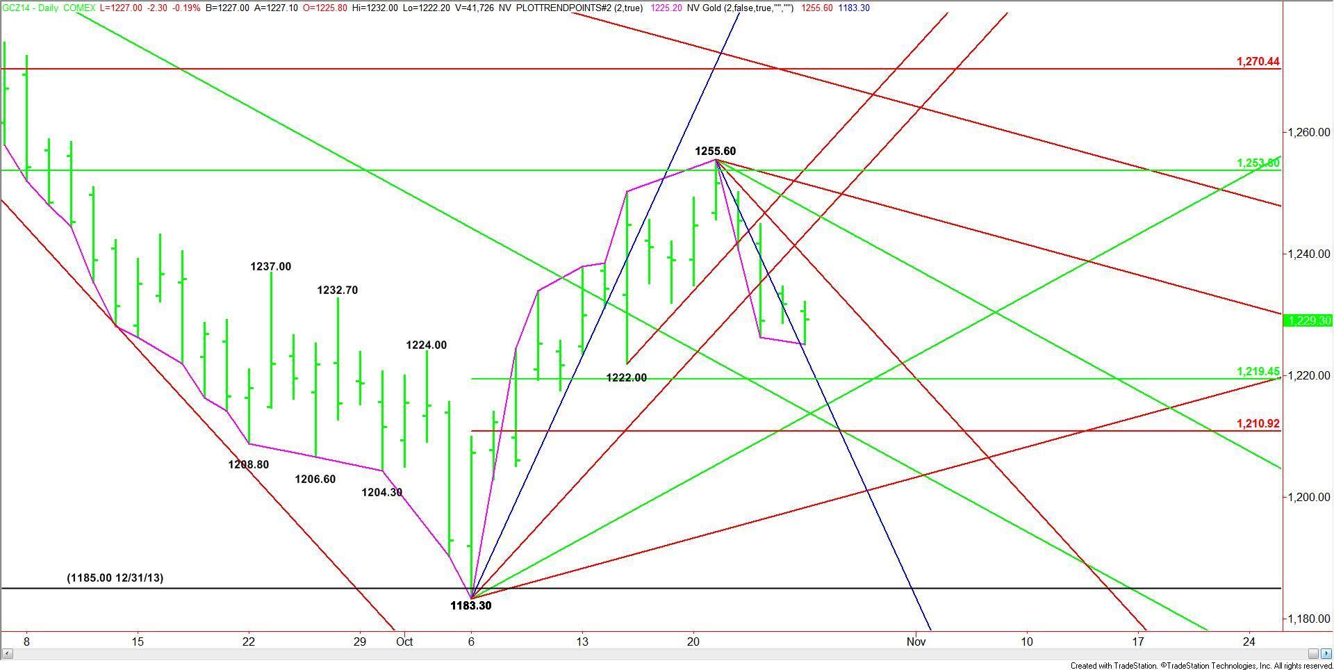 December Comex Gold futures inched lower on Monday, putting the market in a position to weaken further. The main range is $1183.30 to $1255.60, making the primary target its retracement zone at $1219.40 to $1211.00.