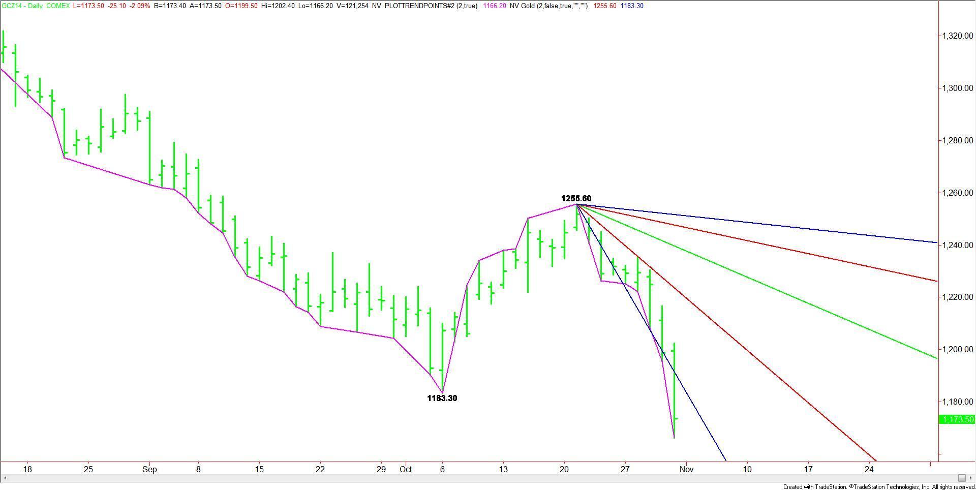 Gold accelerated to the downside right after the BOJ announcement, taking out the recent main bottom at $1183.30. Although there may be a few intraday short-covering rallies or countertrend technical bounces, it looks as if this market can eventually trend lower into the low of the year into the next support angle on the monthly chart at $1024.00.