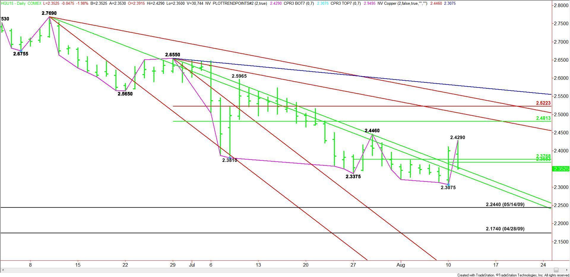 On Monday, September Comex High Grade Copper futures posted a potentially bullish outside move, closing price reversal bottom. Although the session began with the market technically oversold, the move is suspicious because it came before the People’s Bank of China made its currency devaluation announcement. It looks as if the insiders knew about the devaluation and were able to aggressively cover some of their shorts before the news was released.