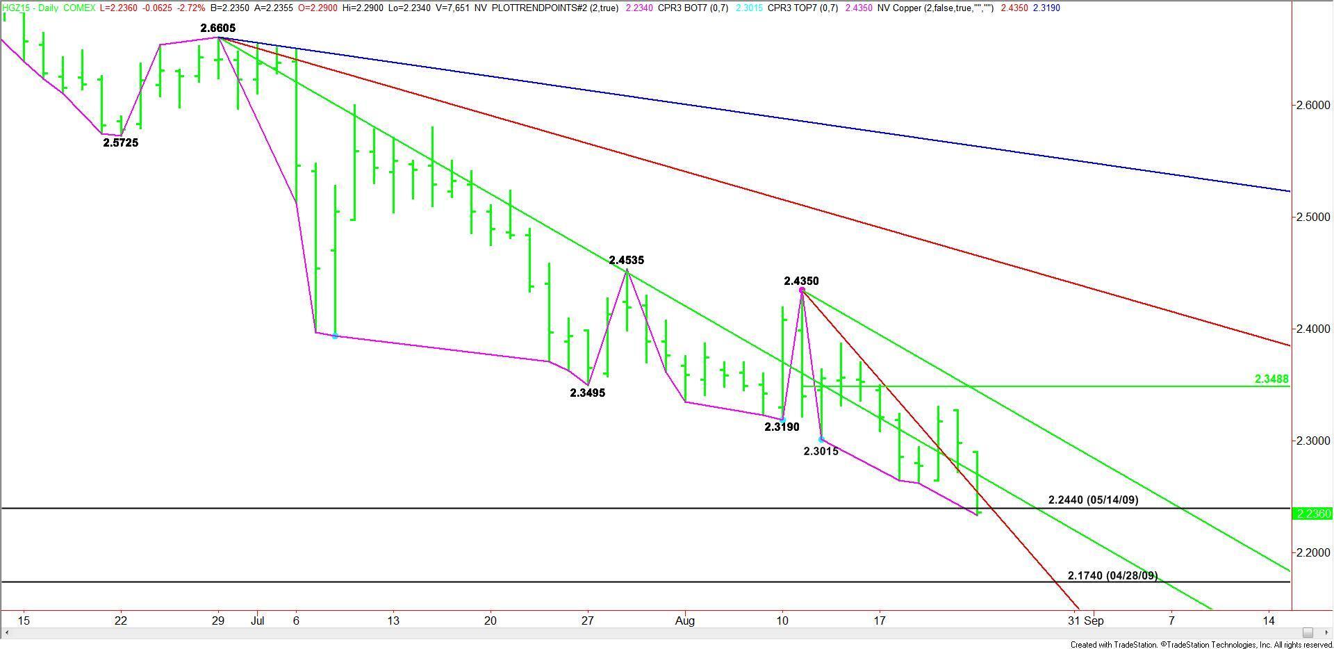 A sustained move under 2.2440 later today will indicate that the selling is real and getting stronger. This could trigger a further break into the April 28, 2009 main bottom at 2.1740.