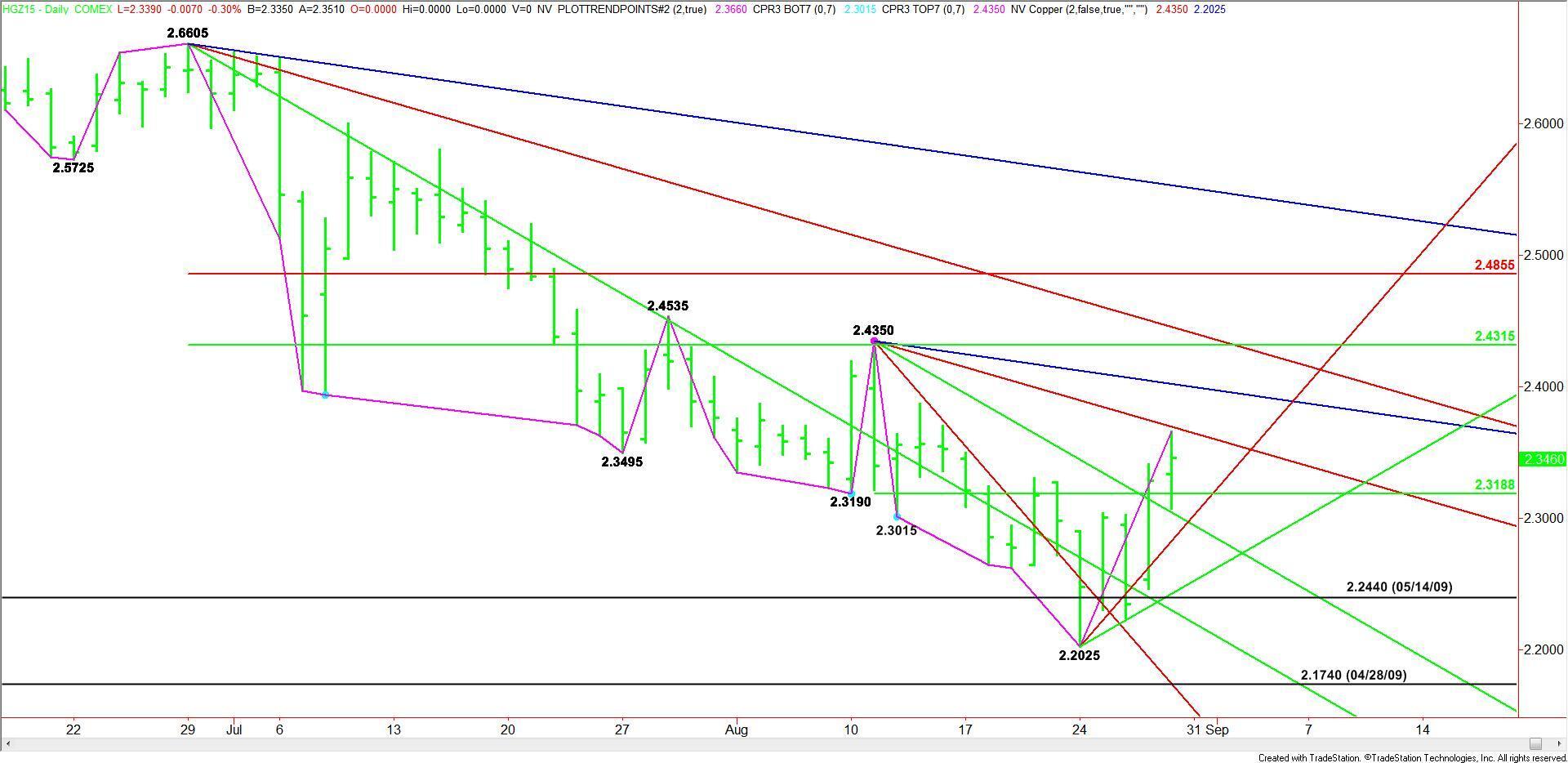 December Comex High Grade Copper futures surged to the upside on Friday, taking the market to its highest level since August 14. Although the main trend is still down on the daily chart, a new main bottom has formed at 2.2025 and momentum has shifted to the upside. A trade through 2.4350 will turn the main trend to up on the daily chart.