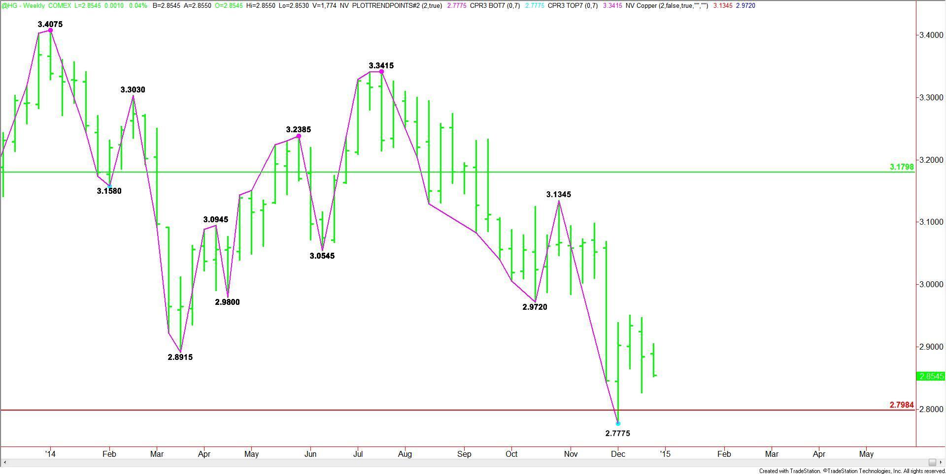 The tone of the market into 2015 will be determined by trader reaction to the major Fibonacci level at 2.7985. With copper supply so high even if there is a short-covering rally because of short-term oversold conditions, the upside is likely to be limited as bearish traders stand ready to short this market again at more favorable price levels.