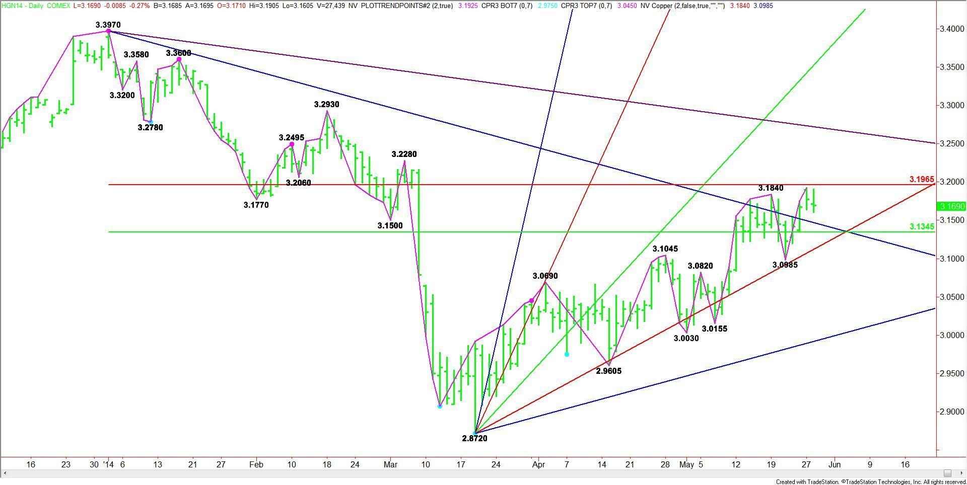The first sign of weakness will be the failure to takeout 3.1965. A move back under a downtrending angle at 3.1470 will be the next, however, the best sign that sellers are taking control will me a trade through the 50% level at 3.1345. This could lead to a test of an uptrending angle at 3.1120.