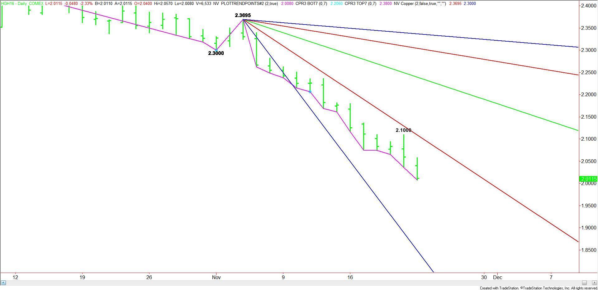 Based on the current price at 2.0070, the daily chart indicates there is plenty of room to the downside with the nearest target coming in at 1.8495. The closest upside target is Friday’s high at 2.1000 and a downtrending angle at 2.1095.