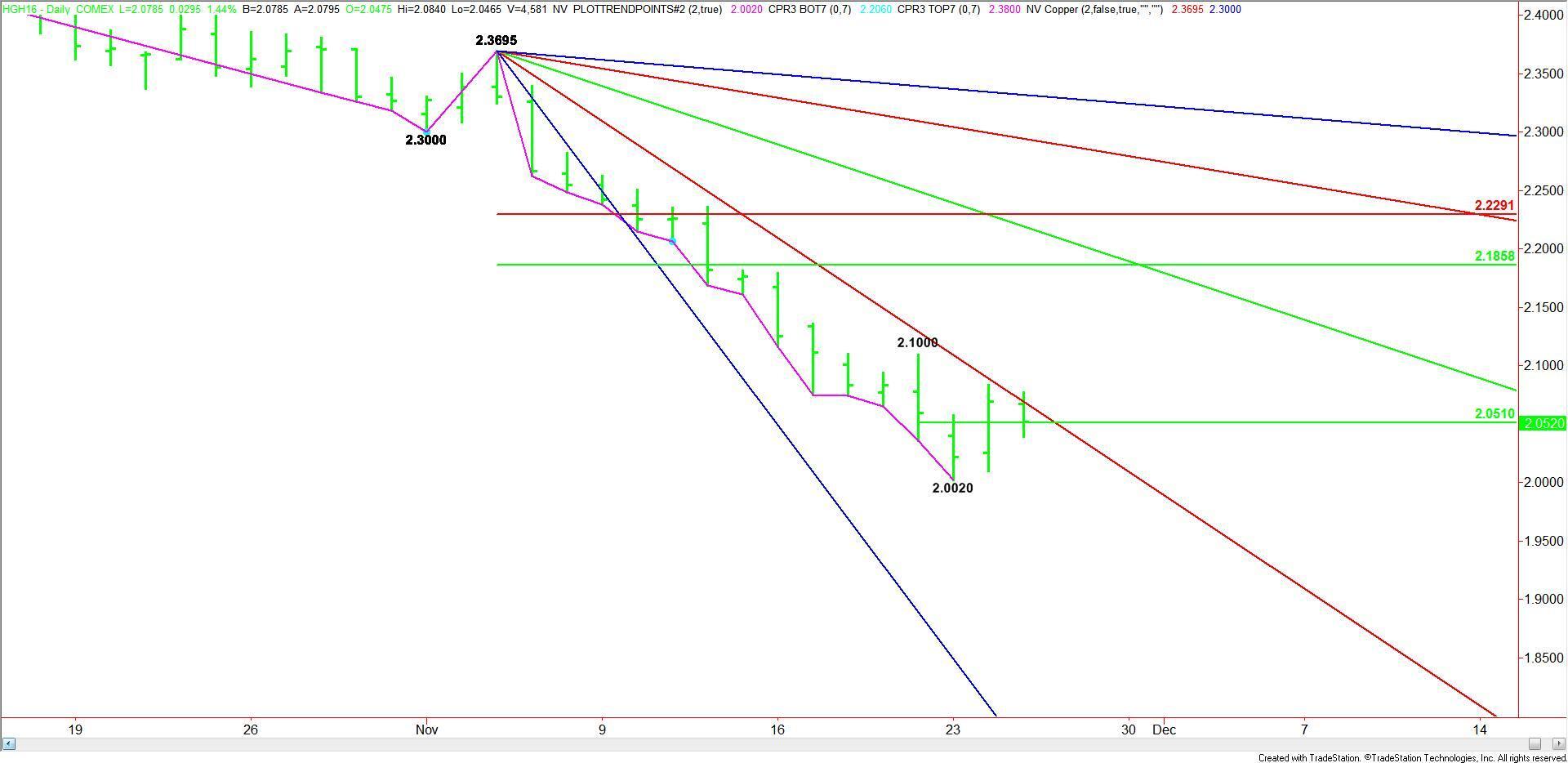 Based on the close at 2.0520, the direction of the market today is likely to be determined by trader reaction to the short-term pivot at 2.0510 and the steep downtrending angle at 2.0495.