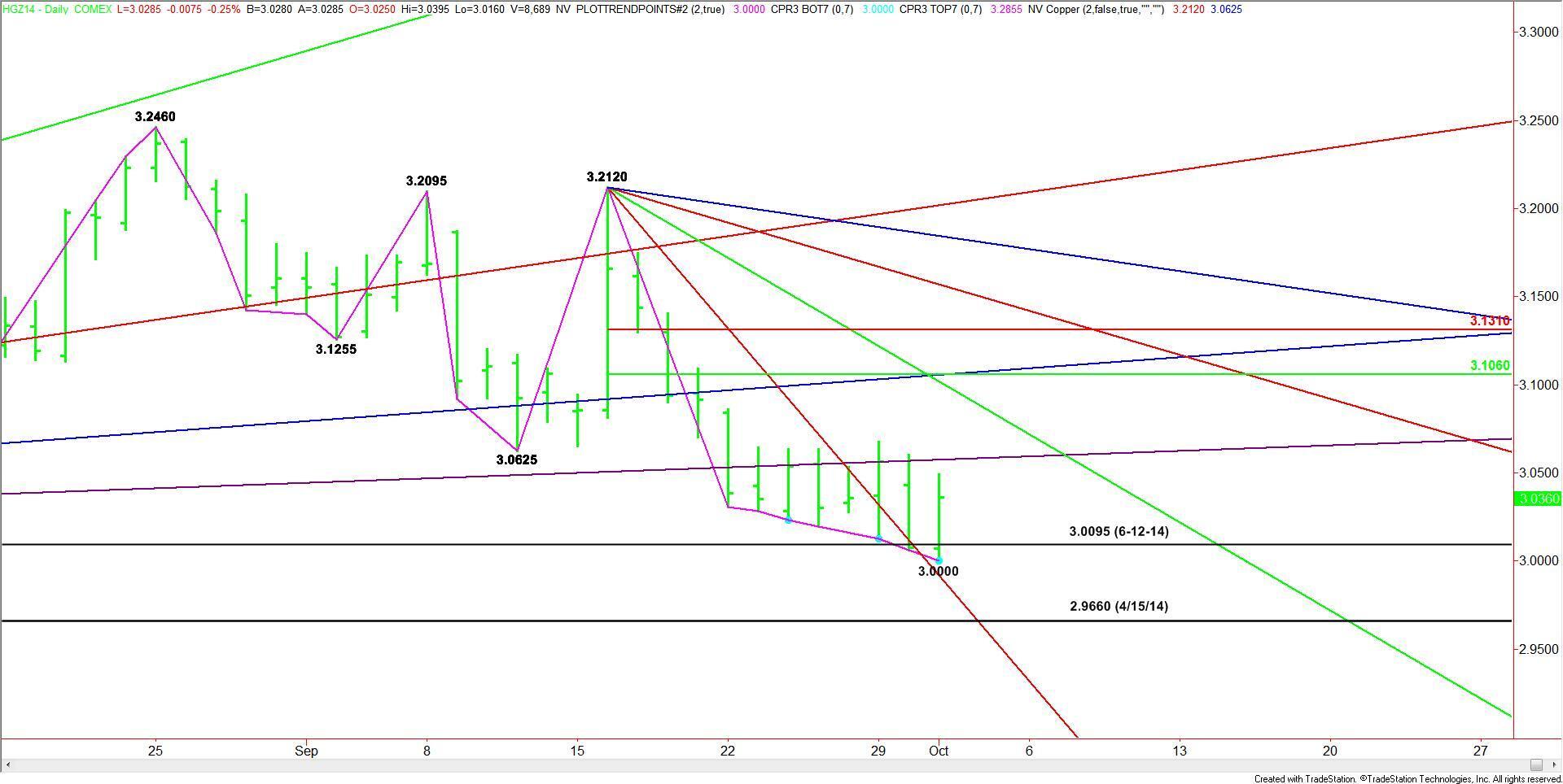 December Comex High Grade Copper futures broke through the June 12 bottom at 3.0095, but buyers came in at the psychological 3.000 level, to produce a