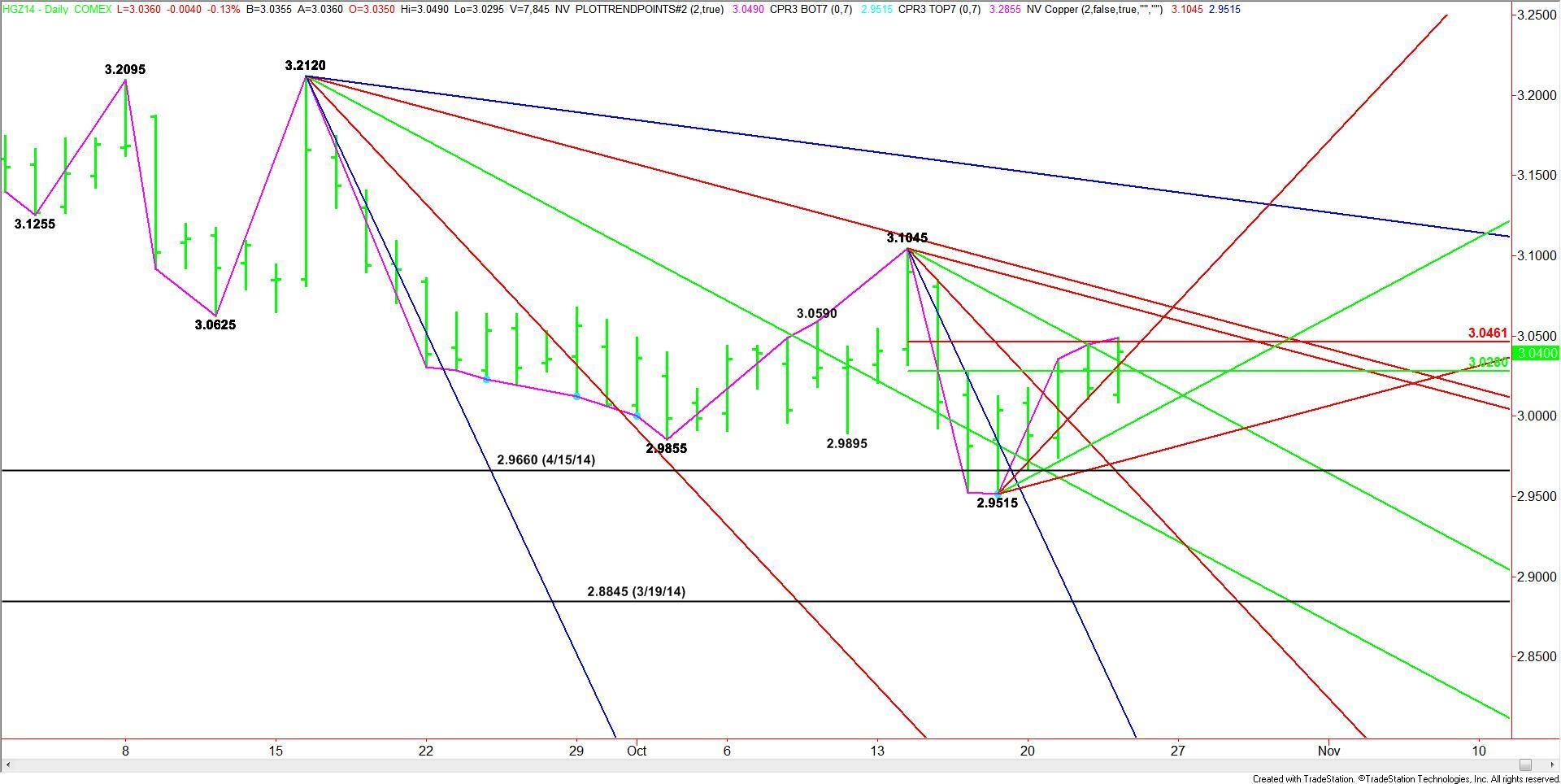 December Comex High Grade Copper futures inched through a Fibonacci level on Thursday, but the buying stopped and the market settled higher, inside the 3.0280 to 3.0460 retracement zone. This zone is a key pivot area that will decide the next major move.
