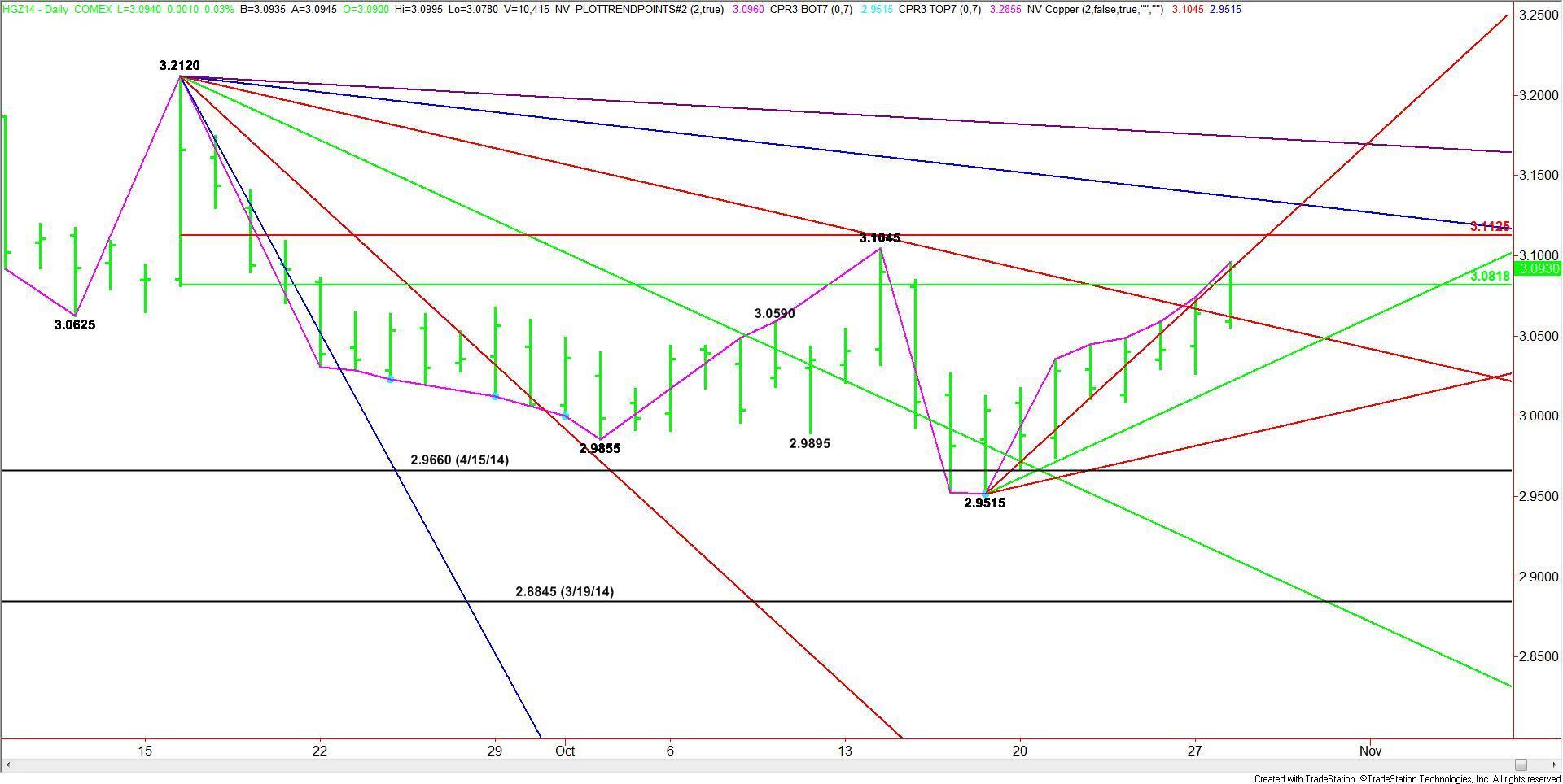 December Comex High Grade Copper rallied for the seventh day on Tuesday. Although it reach a major retracement zone that could turn into a resistance area, the upside momentum was strong enough to put the market in a position to challenge the October 14 main top at 3.1045. A trade through this level will turn the main trend to up on the daily chart.