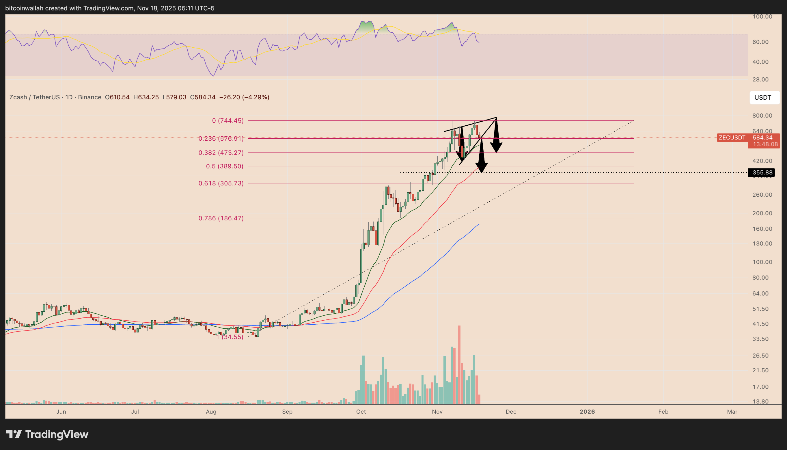Zcash is now trading inside a classic rising wedge pattern on the daily chart, a structure that typically appears near the end of strong uptrends and often precedes sharp corrective moves.