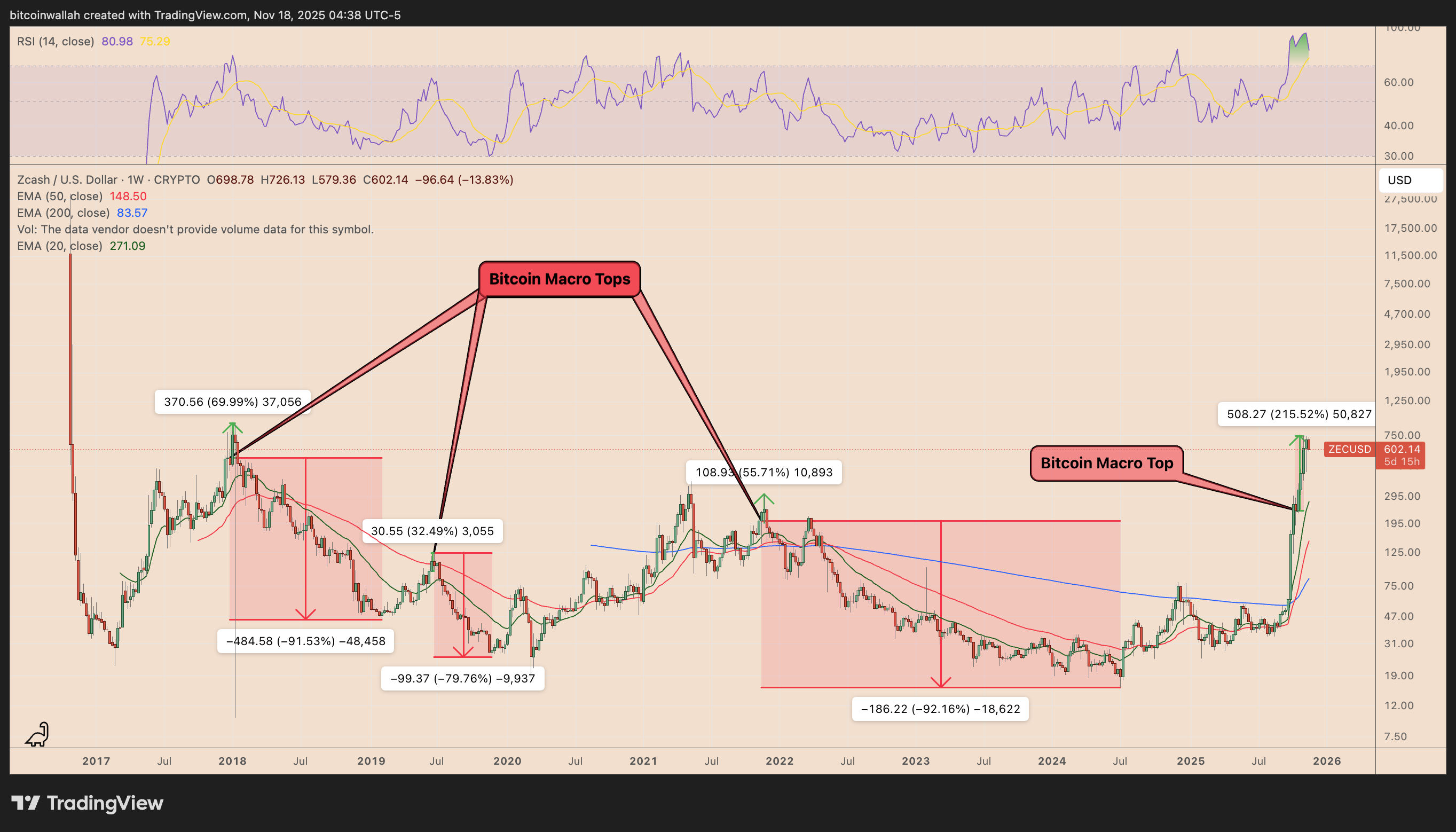 ZEC’s weekly chart highlights the bearish fractal across three major cycles.