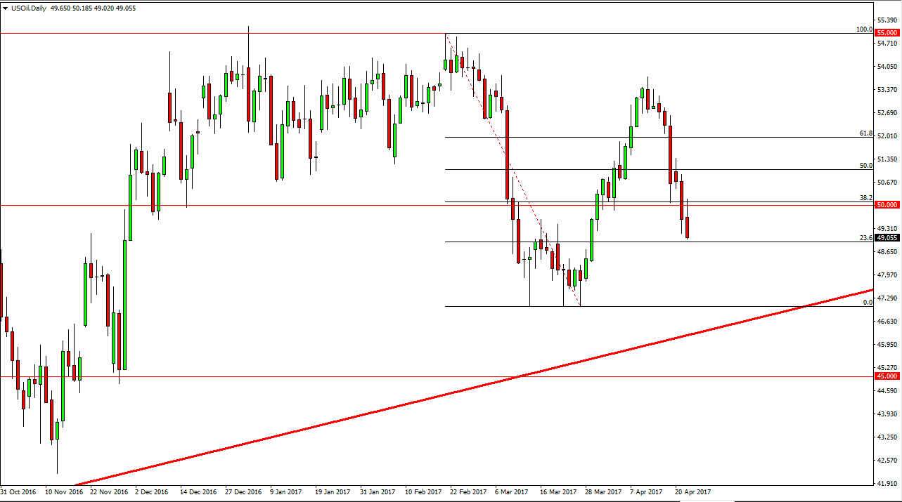 The WTI Crude Oil market initially tried to rally during the day on Monday but found the $50 level to be far too resistive. We turned around and fell significantly, reaching towards the $49 level. Currently, I believe that hedge funds are starting to step away from the oil markets, and that every time we rally it is going to play out as a nice selling opportunity as oil markets are dealing with massive oversupply. OPEC production cuts will have little effect longer-term in my estimation, so I believe that we are finally starting to see fundamentals work back into the markets again. I believe the market is going to go looking for the $47 level underneath, but we could get a rally from time to time to pick up more value for the sellers.
