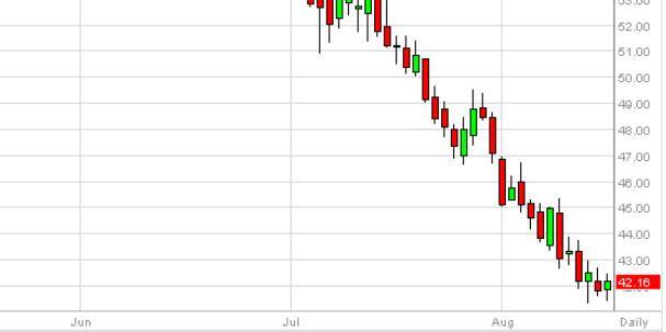 Brent markets continue to grind a little bit lower during the session on Tuesday, but quite frankly we believe that this is a market that desperately needs a bit of a bounce. That gives people the opportunity to step back into the market and start selling again, which at this point in time would be a bit risky as we have basically been in a freefall for a couple of months. We believe that a bounce is a selling opportunity at higher levels, and we will use those bounces as that opportunity. We believe that the $52 level above is resistive, and as a result we would love selling a resistant candle in that region. We think that the market could very well drop to the $45 level given enough time, and with that we remain bearish. On the other hand, if we could break above the $55 level, that could change our opinion overall. Keep in mind that the summertime is about to come to a close, and big-money comes into the marketplace at that point in time, quite often setting up the trend for the next several months going forward.