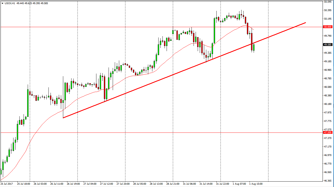 The WTI Crude Oil market fell significantly during the day on Tuesday, as we had gotten a bit overbought. By breaking down the way we have, it’s likely that the markets are trying different run the announcement today. Crude oil inventory announcements tend to be very volatile, and I believe at this point that the market is trying to explode to the upside. If we can break down below the $49 level, it’s likely that we will continue to go lower. Ultimately, this is a market that should continue to see volatility, but I believe that breaking below the one-hour trend line is a negative sign. Given enough time, the market should reach towards the $47.50 level, but that may take some time. Alternately, if we get some type of bullish inventory number, that could turn things right back around. Longer-term, I remain bearish of the oil markets.