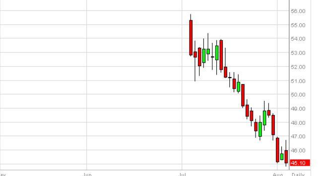 The light sweet crude market initially tried to rally during the course of the day on Wednesday, but struggled as we approached the $47 level. This area was previously supportive, so that of course makes sense that it is now resistive. With that, we turned back around to form a fairly negative candle, a shooting star sitting on top of the $45 level. Breaking down below that level would be a significant selling signal, and we would do just that. We have no interest in buying this market, but we do recognize the next day or so might be a little bit quiet as the Nonfarm Payroll numbers come out on Friday. Regardless, we have no interest whatsoever in buying this market, and look at every rally as a potential selling opportunity. The markets are very weak at the moment, and we don’t see that changing anytime soon.