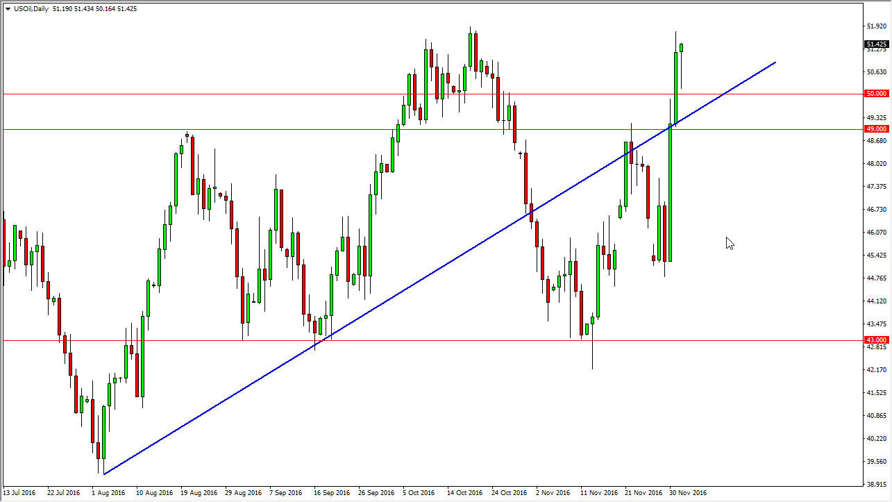 Brent markets of course did very much the same thing, as we found support at the $52.50 region. This is a market that has exploded to the upside and should continue to go higher. In fact, it is a bit more bullish than the WTI market, and could go a little bit higher. Ultimately, I feel that the market will have a lot of the same headwinds that the WTI market could have, namely oversupply and the possibility of a stronger US dollar. Currently, the dollar is soft been a little bit, so that could help, but given enough time I think that the longer-term issues will return. In the short-term though, you have to be bullish as there is simply no reason to think that were in a turnaround right away. If we can break below the $50 level, at that point I would be comfortable selling again, so until then I guess I have to be “buy only” as although I don’t agree with the longer-term outlook of the market, at this point in time there is no way to fight this type of bullish pressure as the move has been so drastic.
