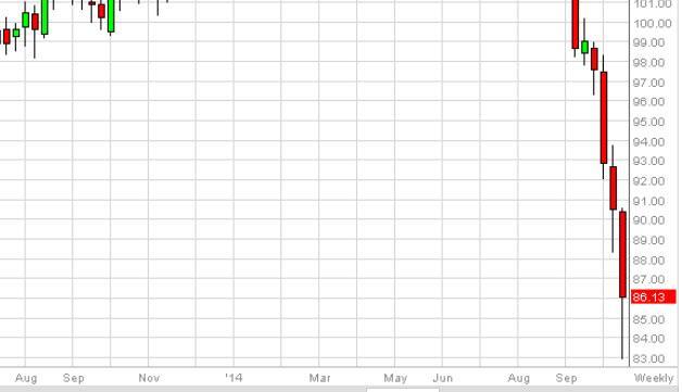 Looking at the shape of the candle, it isn’t quite a hammer, and as a result that is why we believe that this market will continue to sell off as the bounce was fairly tame. I also believe that we will then head down to the next significant support level on the longer-term charts, the $80 level as far as we can tell. With that, we do believe that softness continues in this marketplace, but we have to also recognize that we are approaching dangerously oversold areas any marketplace that has completely fallen off of a Cliff recently. Going forward, we would expect some type of wicked bounce, but it does look like we have it quite yet.