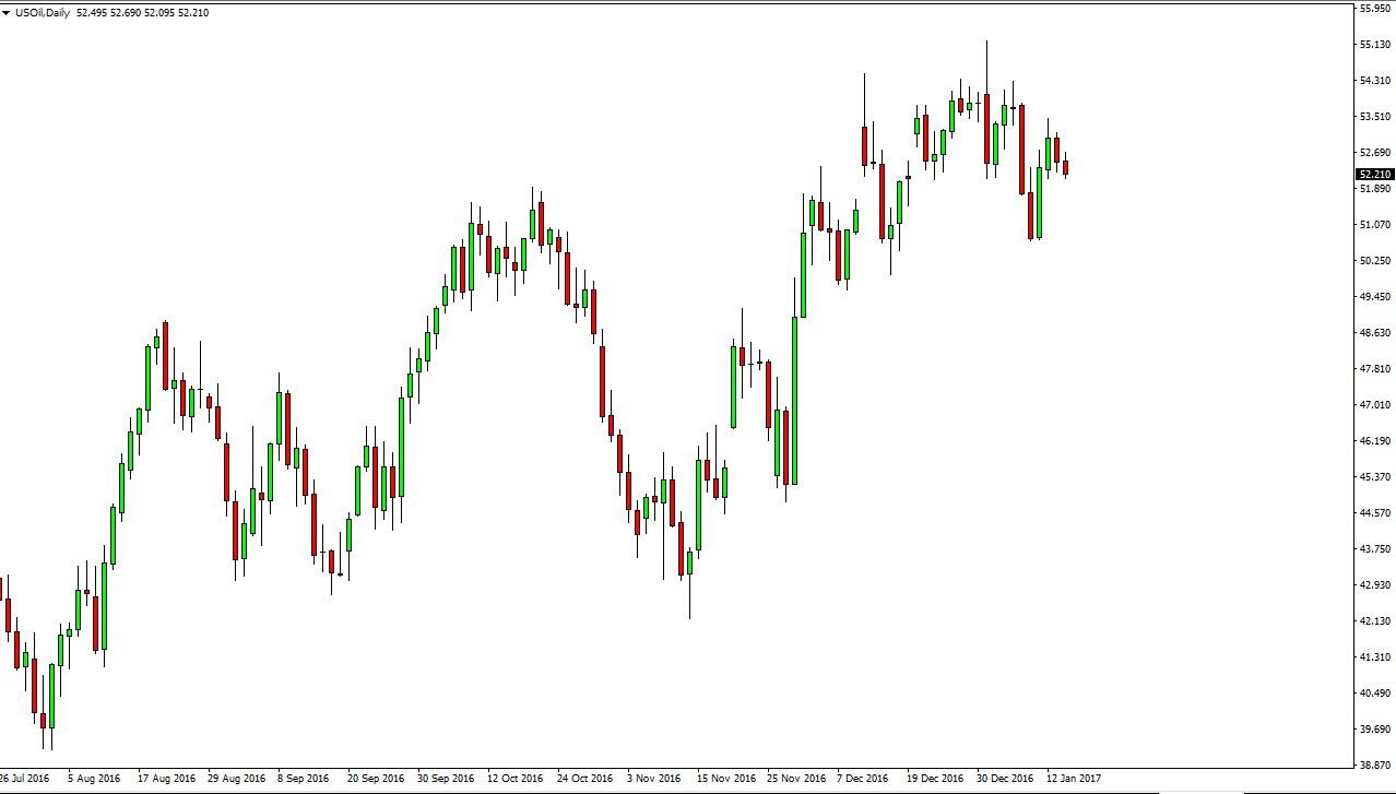The WTI Crude Oil market fell on Monday, but you should keep in mind that the Martin Luther King Junior holiday in the United States would’ve taken quite a bit of volume out of the market. Because of this, you can’t read too much into the candle but when I do see is that the market is trying to roll over in general. After all, there are a lot of concerns when it comes to whether output cuts will be followed, and because of this I think that a little bit of doubt is starting to creep into the market. That doesn’t mean that selling is easy, but quite frankly trend changes never are. I believe that exhaustive candle’s after short-term rallies are selling opportunities but you should realize that there is going to be quite a bit of volatility. Because of this, you may be better off trading short-term charts.