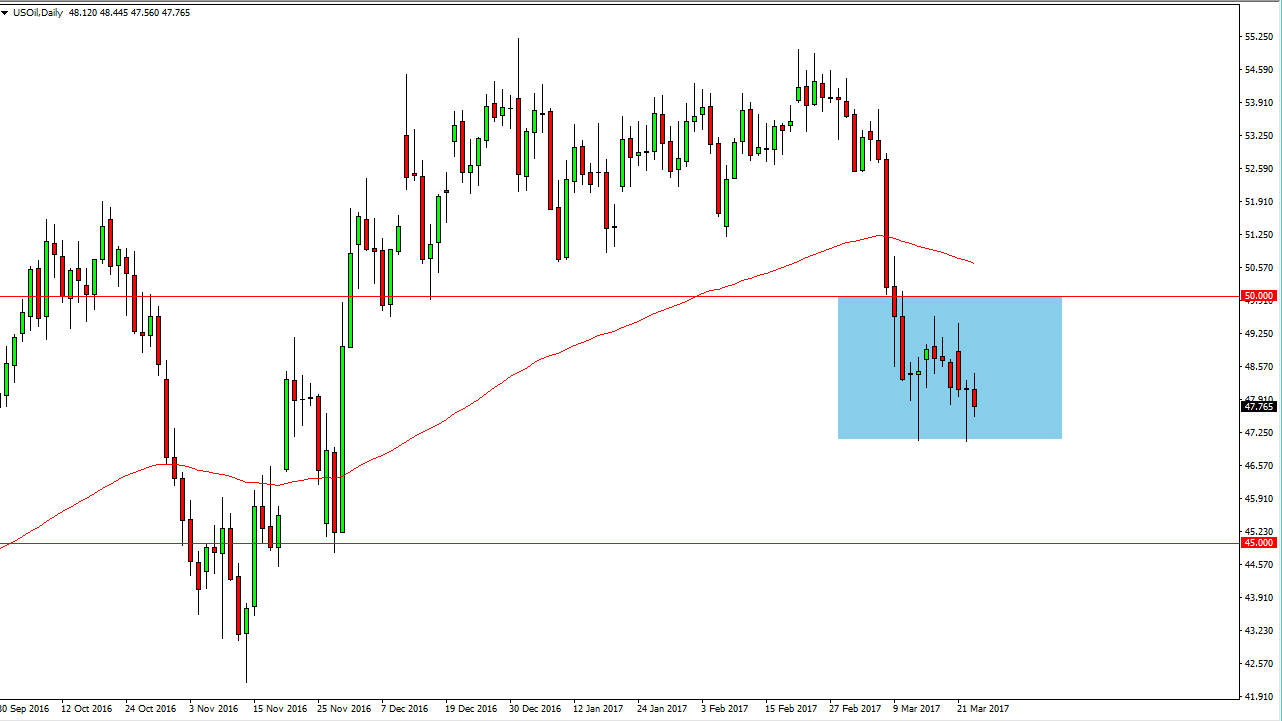 The WTI Crude Oil market initially tried to rally during the day on Thursday, but found enough bearish pressure to continue going lower as we consolidate overall. I believe that the market is going to reach towards the $47 level below, which had been so supportive during the day on Thursday. Because of this, I’m a seller short-term rallies and believe that the markets will continue to offer selling opportunities. A breakdown below the $47 level should send this market down to the $45 handle, which has been very important in the past. It’s a large, round, psychologically significant number so I do believe that there will be a certain amount of interest in that area. Rallies that show signs of exhaustion should be nice selling opportunities, I have no interest in buying but I do recognize that there could be quite a bit of back-and-forth trading in the short term.