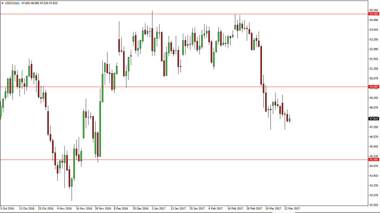 I believe that the downward move that we have seen recently has been very strong, and that suggests to me that the overall attitude of the markets have changed. The oversupply should continue to be very negative, and thus I have no interest in buying. I believe that the markets will continue to punish oil due to the inability of OPEC to control supply anymore. There is far too much in the way of supply coming out of the United States, Canada, Mexico, and several other countries to give OPEC any serious weight when it comes to the markets themselves. The days of OPEC controlling prices for oil are long gone at this point.