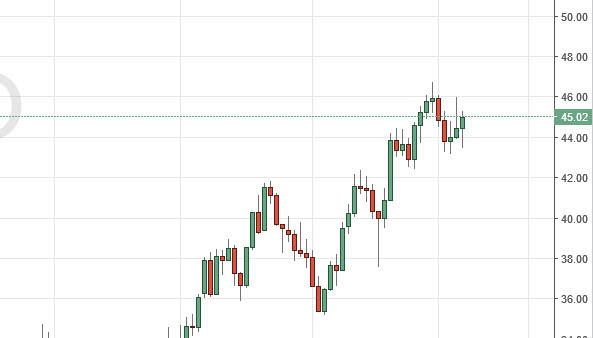 If we break down below the $44 level, we will more than likely try to find support at the $42 handle. We look at that as value still, and are not prepared to give up on the rally until we break down below the $42 handle, and possibly even the $40 handle. If the US dollar continues to fall in value over the longer term, that of course will continue to accelerate the move to the upside here.