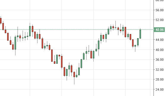At this point in time, I believe that the market is trying to break out to the upside, but it is going to be very volatile in this general vicinity. With this being the case, we are going to have to be patient and therefore buying right here could very well be reckless and also misconstrued as it would ignore the fact that we very well could pull back to the $44 level, and not negate we’ve seen recently as far as the bullish move. A break down below $44 level is of course very negative.
