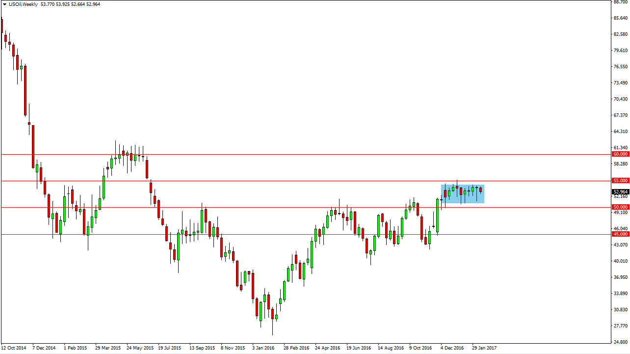 Brent markets fell a bit during the week, testing the $55 level. There is a significant amount of support just below though, so I’m not willing to sell you. In fact, I believe that the market needs a breakdown below the $53 level to give that signal. If we break above the $58 level, the market should then go to the $60 handle. Ultimately, I think that the Brent market is much like the WTI market, in as much as it needs to be traded off shorter-term charts. The market continues to be volatile as traders continue to see volatility, as we are arguing between OPEC production cuts, and oversupply.