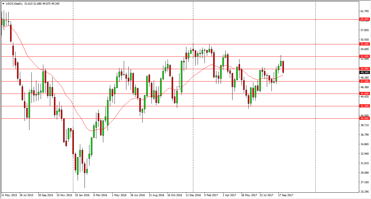 The WTI Crude Oil market broke down during the week, slicing through the $50 level. I think that the $49 level is massively supportive, so if we can break down below there I think that the market continues to go lower, perhaps reaching towards the $47.50 level underneath. Alternately, if we can break above the $50 level, the market should then go towards the $52.50 level. The markets continue to look volatile, and this pullback is probably to be expected. We have a significant amount of oversupply in the market occasionally coming in and affecting the pricing. However, there are a lot of concerns about OPEC, but quite frankly I think it is starting to become very obvious that OPEC has lost its ability to control pricing, and perhaps some of its members.