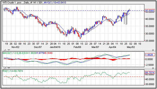 Crude oil prices made new 5-month high at 46.62, with gains driven by overall dollar weakness, and declining U.S. production. Strong imports have boosted
