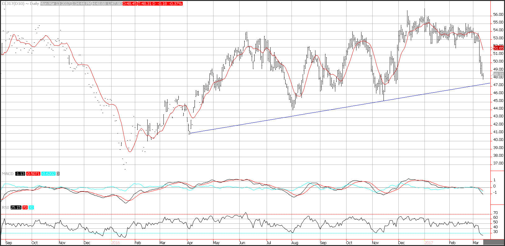 Oil prices moved lower but were able to bounce after printing below the 48 handle for the first time since November. Prices have declined 9% since last Wednesday larger than expected build in crude oil inventories reported by the Department of Energy. On Friday, Baker Hughes, the oil service giant reported an increase in active drilling rigs, which put the total to the largest number of producing rigs since September 2015.