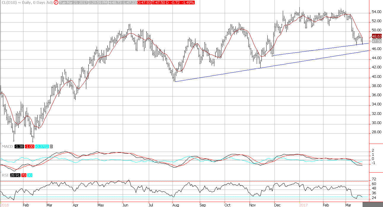 Prices were able to bounce near support at an upward sloping trend line at 47.30 and a break of that level would lead to a test of another upward sloping trend line that comes in near 45.60. Momentum moved lower as the RSI (relative strength index) broke back below the 30-oversold trigger level. If the RSI cannot break below the lows at 25, a divergence could be set up near trend line support. Resistance is seen near the 10-day moving average at 48.63.