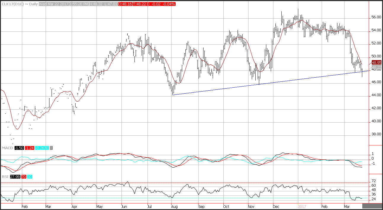 Crude oil prices tumbled to a 4-month low at 47.01, but rebounded despite a larger than expected build in crude oil inventories. WTI Prices closed nearly unchanged rebounding sharply after slicing through trend line support near 47.60. Resistance on crude oil is seen near the 10-day moving average at 48.94. Momentum is negative as the RSI (relative strength index) moved lower along with price action, but the current print of 27.8 is below the oversold trigger level of 30 and could foreshadow a correction. Momentum as reflected by the MACD (moving average convergence divergence) index is also negative as the index is print in the red with a downward sloping trajectory.