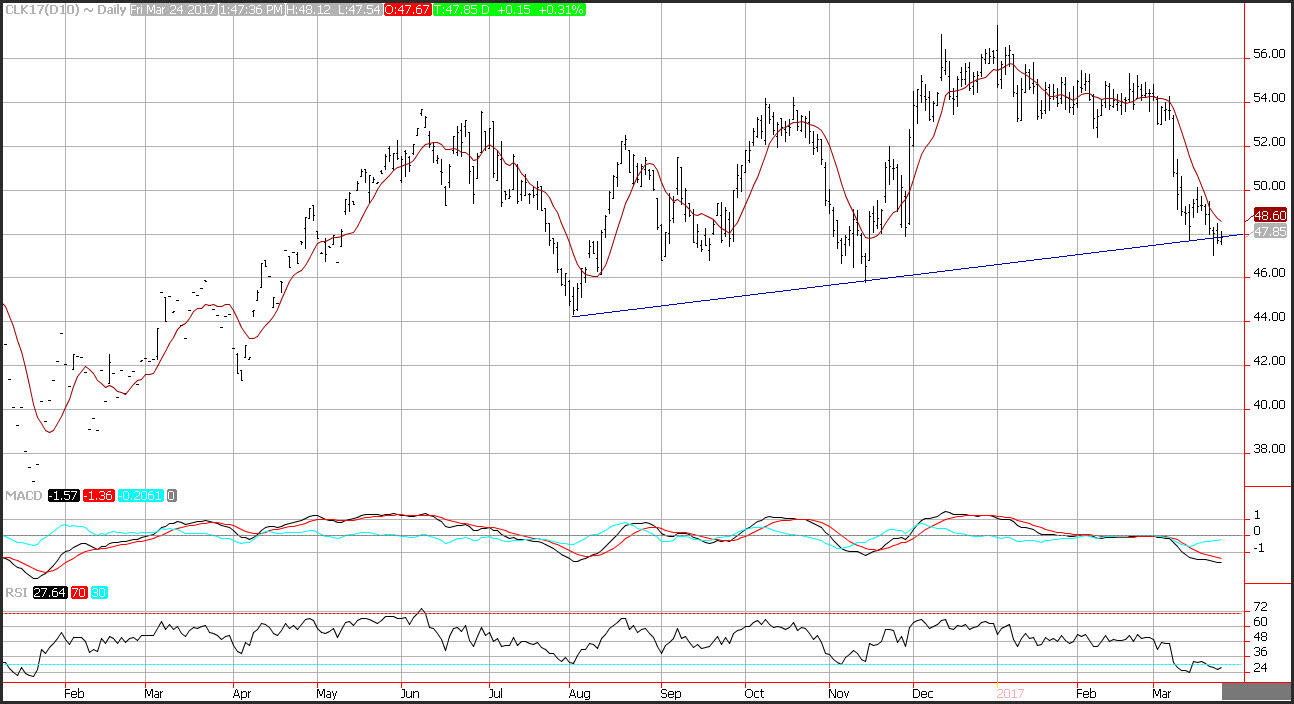 Crude oil prices were slightly higher on Friday supported by news that Saudi Arabia has reduced exports to the U.S. by about 300k barrels per day in March. Nonetheless, U.S. stockpiles remain at record levels, currently over 530 million barrels, as U.S. shale production offsets OPEC/NOPEC output cuts. Additionally, active oil rigs have climbed every week in 2017 but one. Support on crude oil prices is seen near an upward sloping trend line at 47.70. Resistance is seen near the 10-day moving average at 48.60. Prices remain oversold with the RSI (relative strength index) printing a reading of 27, below the oversold trigger level of 30 which could foreshadow a correction.