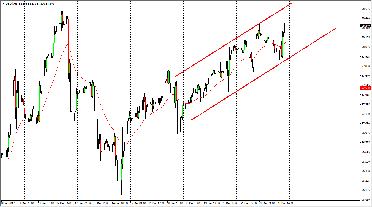 The WTI Crude Oil market initially dipped during the trading session on Friday, but found enough support on the one-hour trend line that I have marked on the chart to continue to go higher. We are in a bit of another uptrend channel, and I think that could continue to drive this market higher. However, the $60 level above looms large, so the meantime I think that is probably as high as we get in the short term. Alternately, if we break down below the $57.75 level, we probably drop a bit from there. Volatility continues to be an issue, but I think oil traders are looking to buy.