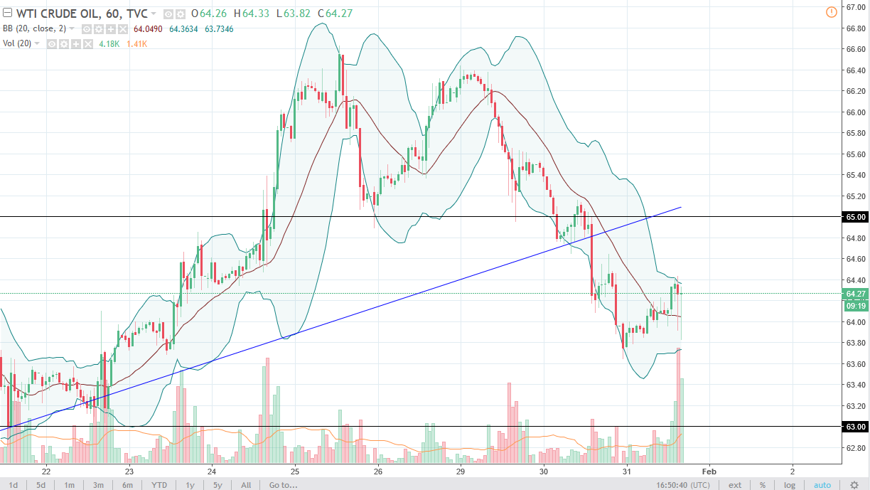 WTI Crude Oil markets initially drifted a bit lower during the trading session on Wednesday, but then rallied significantly. It looks as if we’re going to try to go towards the $65 level, where I would expect to see a lot of resistance. A break above that level should send this market much higher. As far as shorting is concerned, I don’t have any interest in doing so, as I believe the $63.50 level is going to offer a significant amount of support based upon the daily reaction that we have seen.