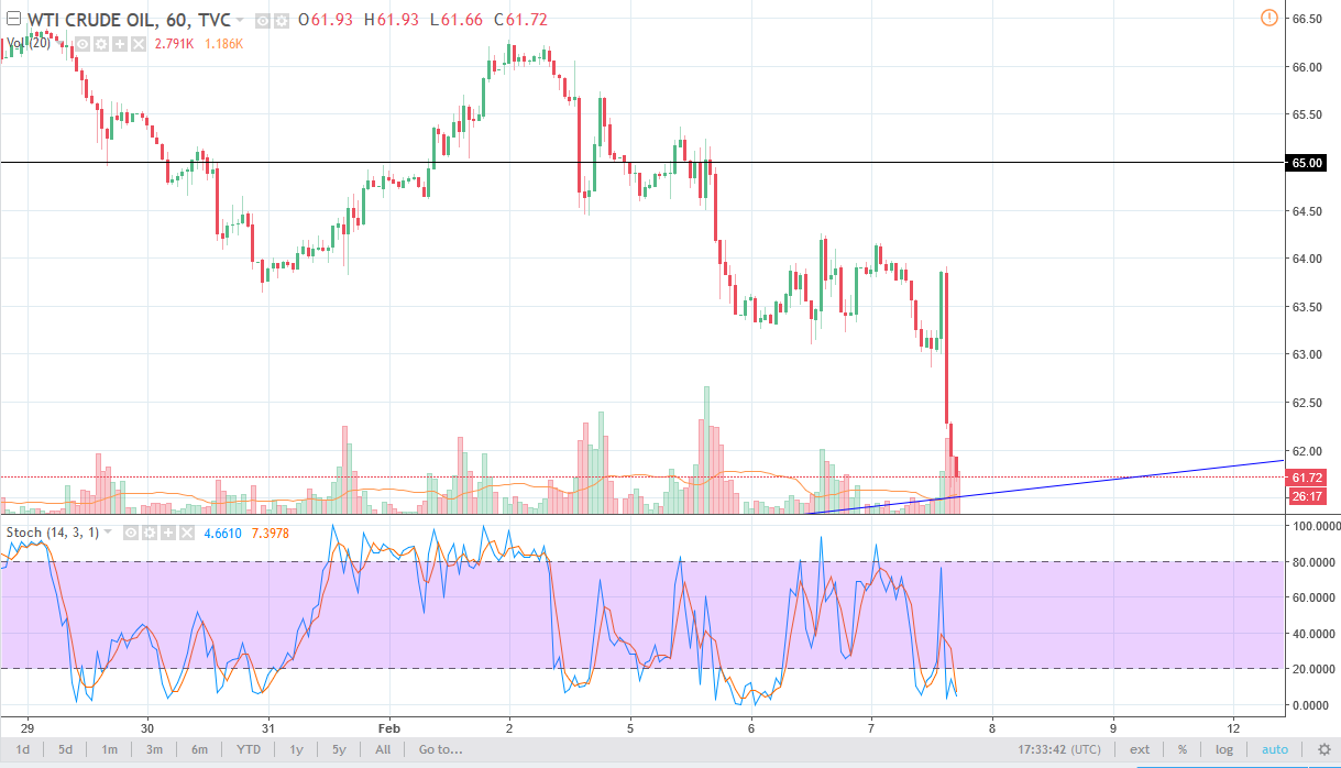 Crude oil markets collapsed during the trading session on Tuesday, as US inventories are starting to grow again, for the 2nd week in a row. This is a very negative sign, and it is likely due to shale producers getting aggressive with higher pricing. You can see on the hourly chart, the market has reacted very negatively, dropping almost 3% immediately.