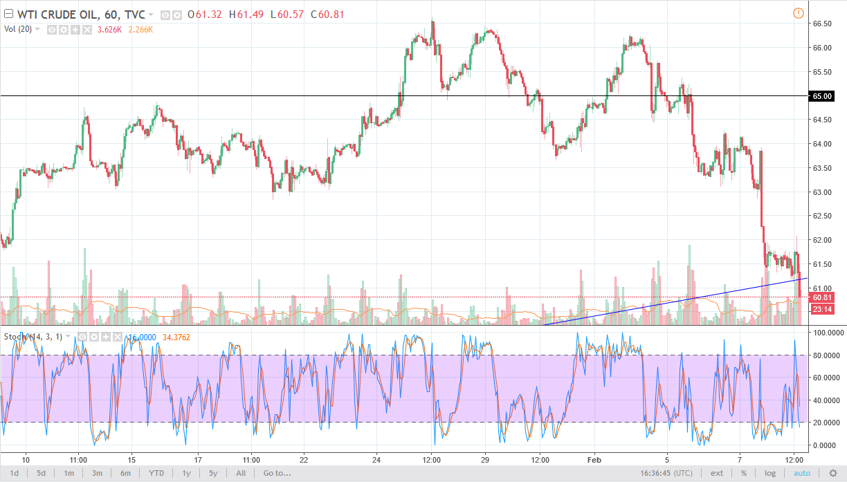 The WTI Crude Oil market has been falling again during the trading session on Thursday, slicing through the uptrend line that held the market higher. I think that we are not only going to go to the $60 level, but I think we are going lower. I look at rallies as selling opportunities going forward, and the $62 level as a bit of a “ceiling” in the short term. Longer-term, we could go down to the $50 level again, and I think we’ve seen the highs for the year. If we broke above the $64 level, then I would be convinced that the buyers are coming back but I don’t see that happening.
