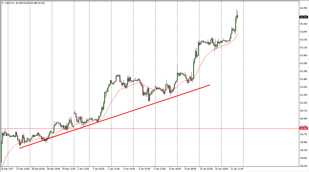 The WTI Crude Oil market continues to rally, but later in the day on Thursday looks likely that we will pull back a bit. I believe that the market will probably find plenty of buyers underneath, near the $63.50 level. That’s an area that I think could cause a significant amount of support though, as it was significant resistance. I believe that the market will continue to find reasons to go higher, at least in the short term. The $65 level above is a large, round, psychologically significant number, and an area that I think buyers are going to be looking towards. We have been in an uptrend for a while, and I suspect that’s going to be the way going forward although there are some potential storm clouds on the horizon.