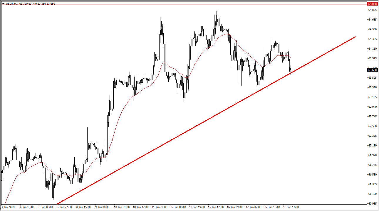 The WTI Crude Oil market fell towards the uptrend line during the trading session on Thursday, as we have seen massive amounts of support. I believe that the $63.50 level offers a significant amount of support underneath, and I think that given enough time we could bounce and reach towards the $64.30 level. Longer-term, I anticipate that the oil markets will probably go looking towards the $65 level, which of course will be a large, round, psychologically significant barrier. If we break down below the $63 level, then the market unwinds and goes looking towards the $60 level next. Overall, the market is very volatile, but one scenario is that the oil markets continue to gain due to the US dollar falling, if nothing else.