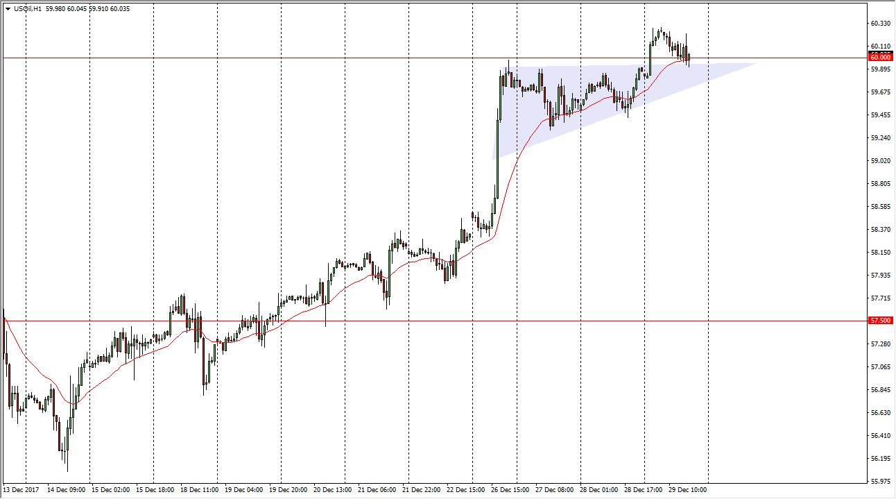 The WTI Crude Oil market rallied a bit during the trading session initially, but found Friday to be too insignificant to continue the movement. We are starting to hover around the $60 level, and I think this is probably where we are going to start looking for support. If we can break above the $60.30 level, the market should then be able to go to the $62.50 level over the longer term. I think pullbacks continue to be buying opportunities, and as you can see on the hourly chart, I have an ascending triangle drawn, and we have broken above it and we are starting to look like a classic breakout just waiting to happen.