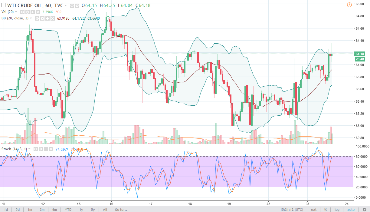 The WTI Crude Oil market initially dipped during the trading session on Tuesday but found enough support near the $63.75 level to rally again. The market is choppy, but I think it is attracted to the $65 level above, which has been resistance in the past. It’s a large, round, psychologically significant number, and it’s likely that the typical attraction to the round number will influence the market as oil markets are extraordinarily technical. If we can break above the $65 level, the market is free to go much higher. In the meantime, I suspect that short-term pullbacks are buying opportunities for those who are nimble enough to take advantage of them. A breakdown below the $63 level would be negative though.