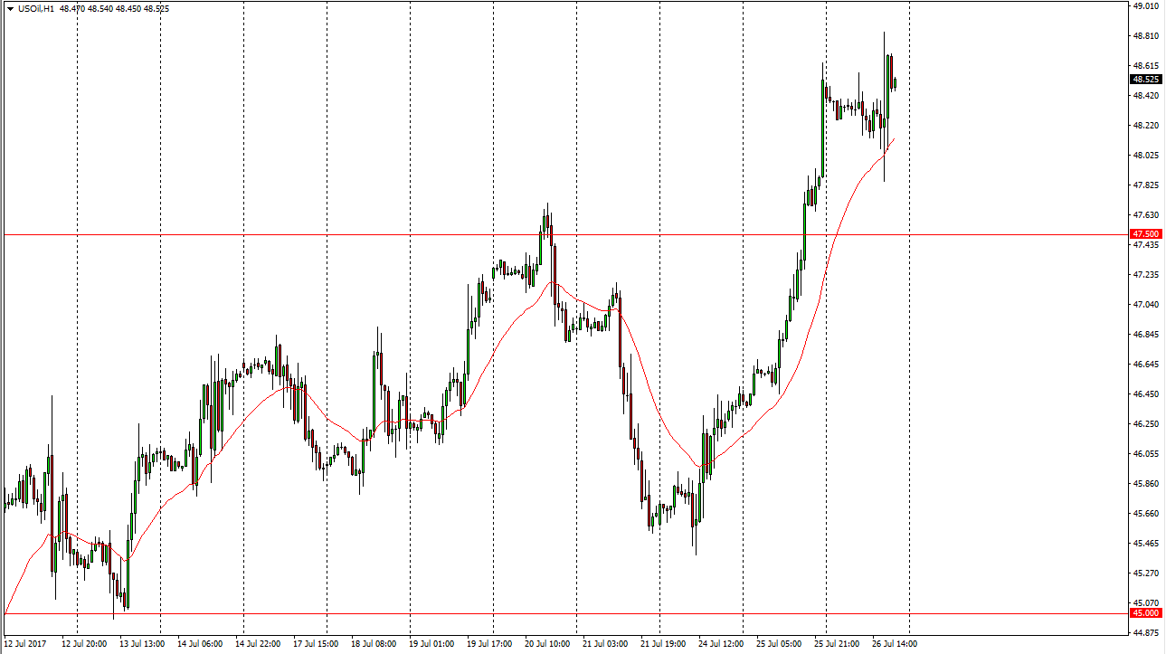 The WTI Crude Oil market went sideways initially during Wednesday trading, but found buyers underneath. Because of this, looks as if the buyers are ready to jump back into this market and continue to push towards the $49 level. I ultimately am waiting to see the market reach towards the $50 level, where I would be more than willing to start shorting again. Alternately, if we break down below the $47.50 level, I would be a seller. Either way, although I recognize that the short-term is probably going to be a bit bullish, but I think that the real momentum will be to the downside on the longer-term charts as the oversupply issues will continue to be an issue. True, some OPEC members are starting to focus on cutting production even further, but quite frankly the shale producers in the United States will fill that void.
