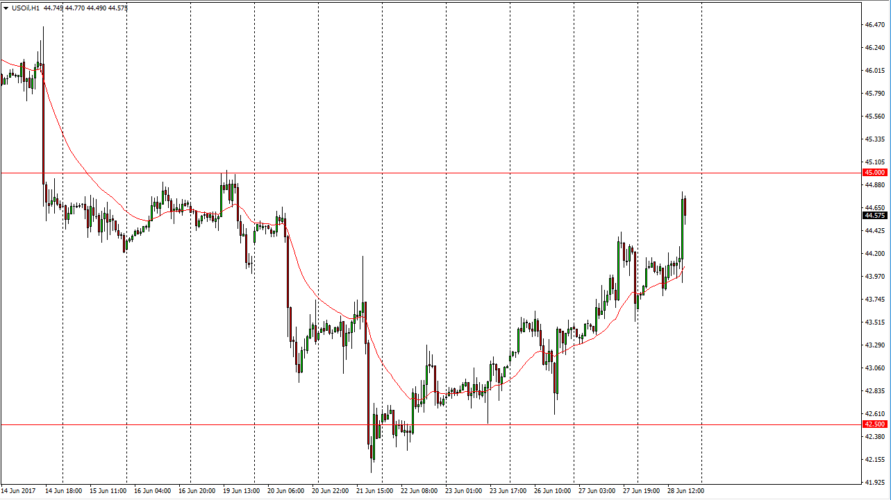 The WTI Crude Oil market rallied a bit during the day on Wednesday when it opened, and then went sideways. The 24-hour exponential moving average continues to offer support, and I believe that the market should continue to find buyers on dips. The $45 level above is a major resistance barrier though, and we have not broken above there at the time of recording. If we do break above there for any real length of time, I feel that the market then goes to the $46 level. It is not until we close above there on at least an hourly chart that I’m willing to put money to work though, so in the meantime I’m going to be patient. If we do show signs of rolling over, I then am a seller as the market will probably go down to the $44 handle underneath. The oil markets got a mixed message from the inventory announcement during the day.