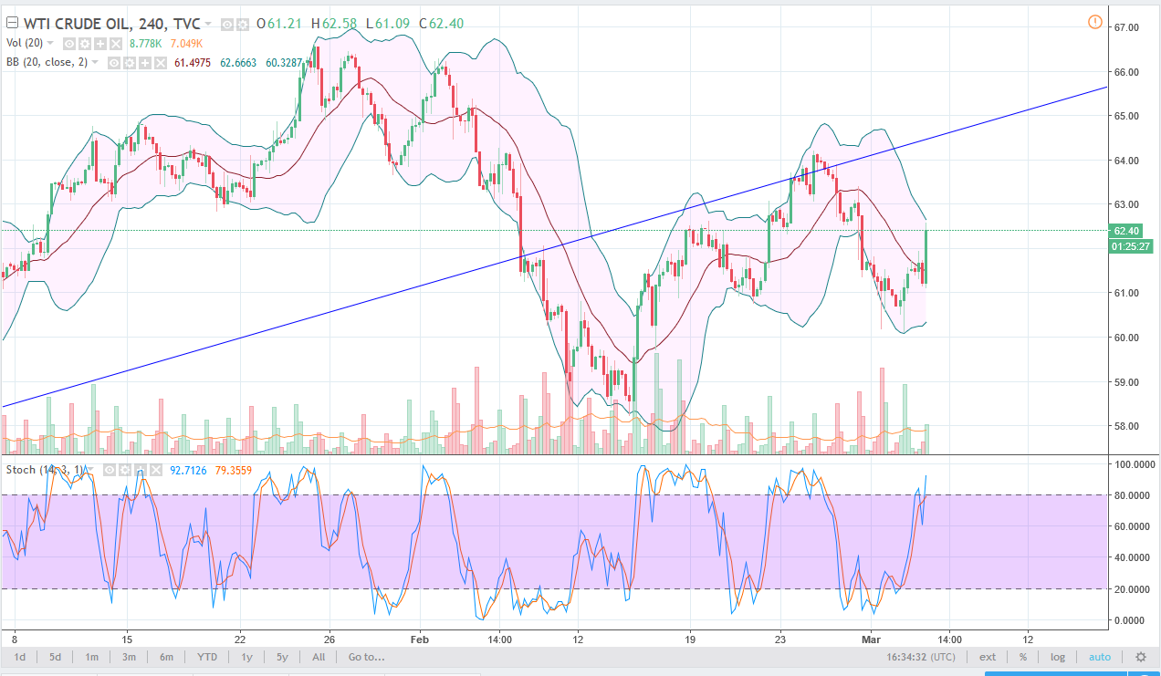 The WTI Crude Oil market rose towards the $62.75 level at the time of writing and seemed poised to test the $63 level. Ultimately, I think some resistance will come back into this market, between here and the previous of trend lines. The markets continue to see a lot of noise in this market, but this most recent bullish move should continue to make things interesting. There are rumors of potential production cuts coming out of OPEC, but we have also seen some ministers say that it hasn’t been discussed yet. Because of this, I think that we will continue to see a lot of volatility, and it’s only a matter of time before the sellers return. I’m looking for some type of exhaustive candle after this move to start shorting.
