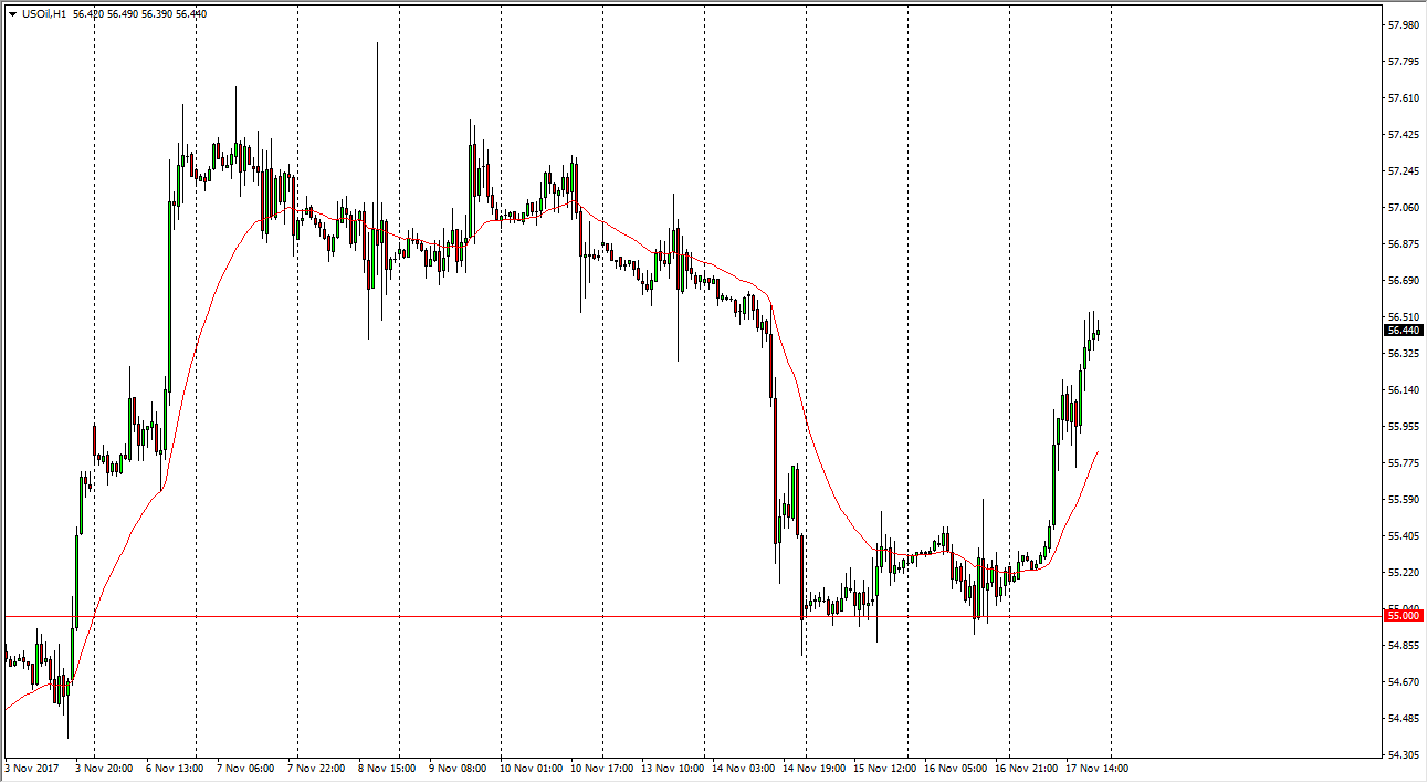 The WTI Crude Oil market exploded to the upside during the Friday session, reaching towards the $56.50 level. Is an area that was previous support, and now looks likely to be resistance, least in the short term. I suspect that we are going to roll over a little bit, but should find plenty of buying pressure underneath. The $55 level underneath should be support, as it has been recently. I believe that the market is ready to go higher, and the weekly chart looks very bullish as it has formed a hammer. That’s a very bullish sign, and I think that we should continue the run to the upside, unless we somehow break down below the $55 level, which at that point I think the market would come undone. I do believe that eventually we get sellers coming into the market, but right now it continues to be a “buy on the dips” scenario.