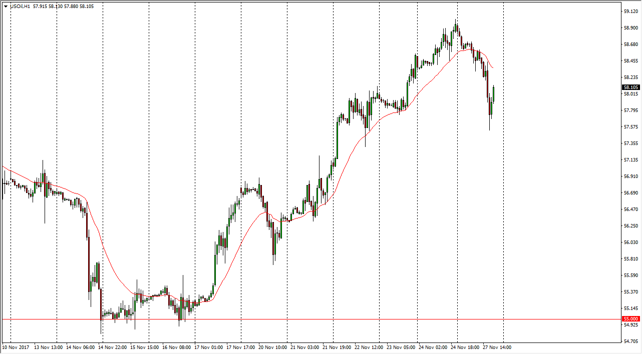 The WTI Crude Oil market fell significantly during the trading session on Monday, reaching as low as $57.50. We did bounce from there though, and reached towards the $58 level. A break above there should send this market to the $59 level again, and the pullback, although rapid, has been necessary and well needed. I believe that the market is still looking to reach the $60 handle above, and even though higher crude oil prices will attract more American drillers, I think that $60 is too obvious of a target for buyers to ignore. If we break down below the lows of the session, we could drop down to the $56.50 level. With this type of volatility though, I think it’s going to continue to be a short-term traders type of situation.